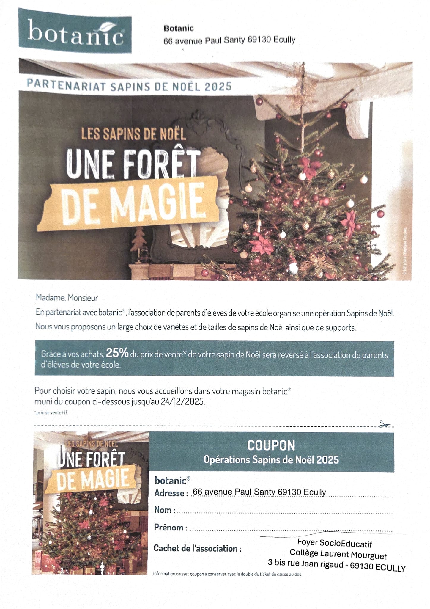 Notre foyer s’associe cette année au magasin Botanic Écully pour une opération “Sapins de Noël” destinée à financer les voyages scolaires.